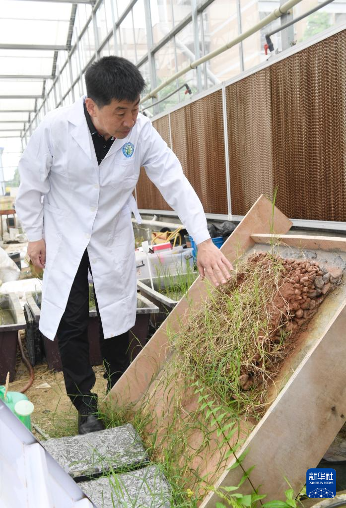 4月20日,在成都理工大學(xué)生態(tài)環(huán)境學(xué)院教學(xué)實踐基地內(nèi),裴向軍在介紹其團隊培育的防沖防淹輕質(zhì)植生塊。新華社記者 劉坤 攝