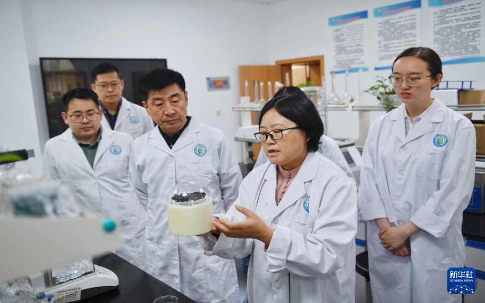 4月20日,在成都理工大學(xué)“四川省地質(zhì)環(huán)境脆弱區(qū)生態(tài)修復(fù)材料與技術(shù)工程研究中心”內(nèi),裴向軍(左三)及團隊成員在展示其研發(fā)的光熱驅(qū)動空氣集水材料及應(yīng)用模型。新華社記者 劉坤 攝