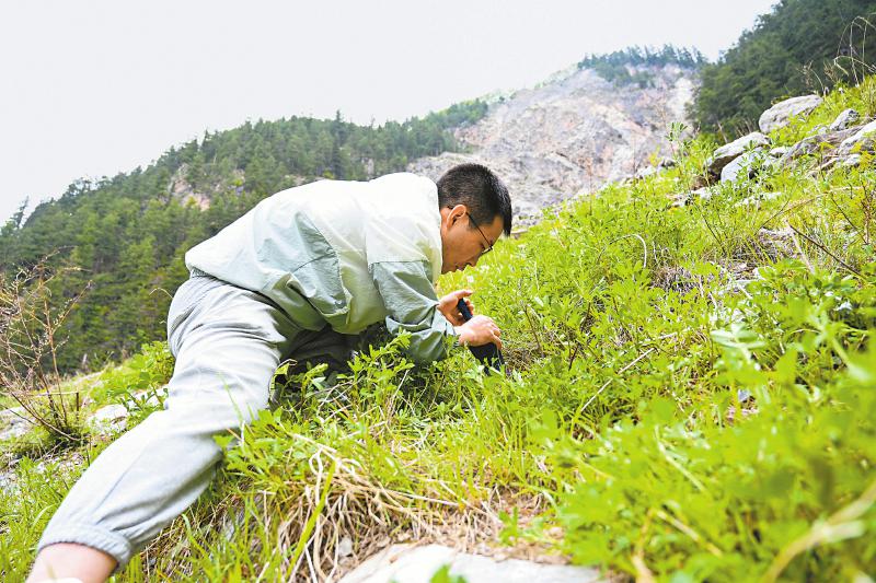 郗紅超在邊坡上查看植物長勢(shì)。任憲平 攝
