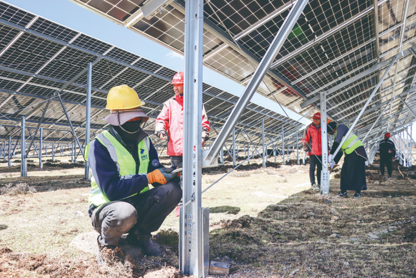 正午的陽光灼熱,呷瑪丁建全副武裝地操作著器械,逐一摸排著光伏板組件的螺絲有無松動、支架有無斷裂、陣列是否完好,同其他20多名工人一道對樂拉光伏電站進行最后一輪安裝收尾消缺工作。工人們動作嫻熟、速度很快,不一會兒,一個光伏板方陣便被“無死角”檢查排患完畢。