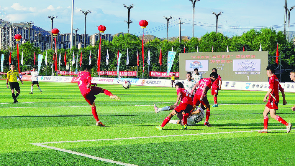 第一個(gè)進(jìn)球后,海東隊(duì)持續(xù)發(fā)動進(jìn)攻,多次制造威脅,海北隊(duì)爭搶激烈,上半場進(jìn)行到23分鐘時(shí),海東隊(duì)再進(jìn)一球,以2比0的比分暫時(shí)領(lǐng)先。攻防不斷轉(zhuǎn)換,海北隊(duì)也不甘示弱,通過高舉高打的戰(zhàn)術(shù),突破海東隊(duì)防線,將比分扳為2:1。