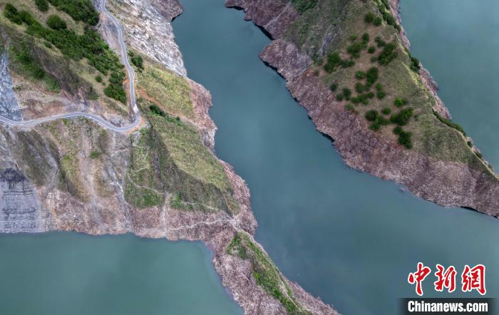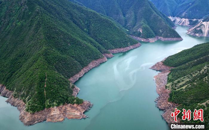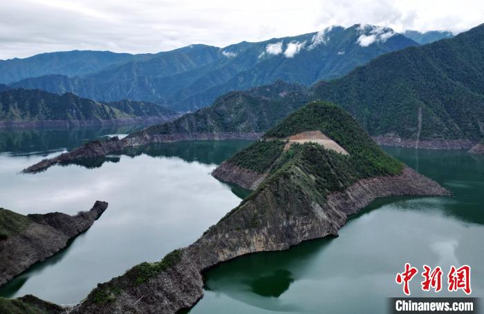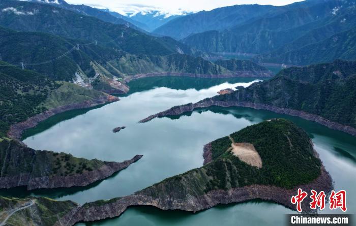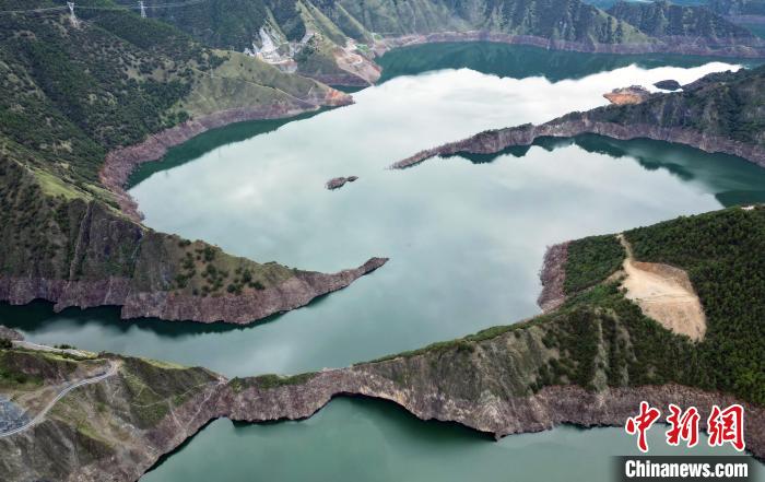 圖為6月25日,航拍蜿蜒山間的天龍湖。(無人機照片)中新社記者 王磊 攝