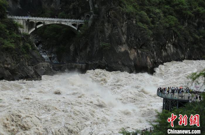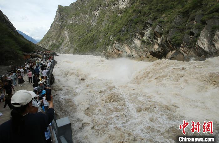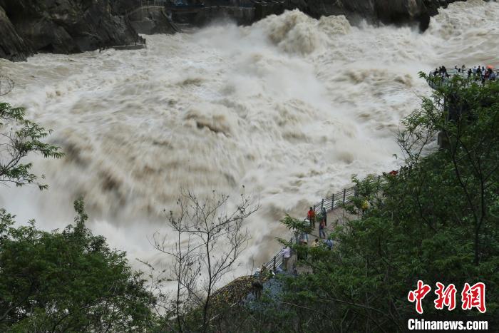 虎跳峽景區(qū)位于云南省迪慶藏族自治州香格里拉市,因猛虎躍江心石過(guò)江的傳說(shuō)而得名。近日該地連續(xù)降雨,金沙江水位上漲,澎湃江水吸引游客。