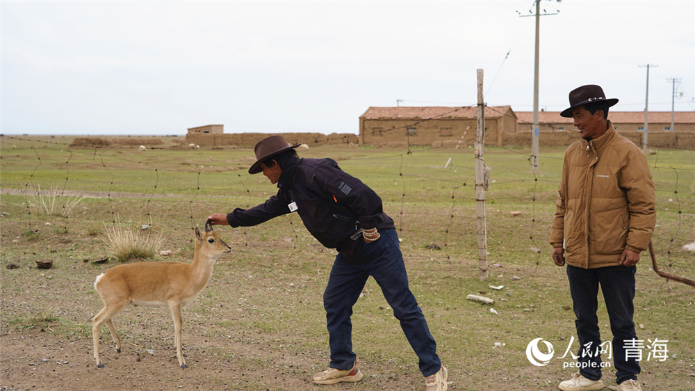 索南才讓和哥哥周增本(右一)與救助的普氏原羚“多杰”互動。人民網(wǎng)記者 楊啟紅 攝