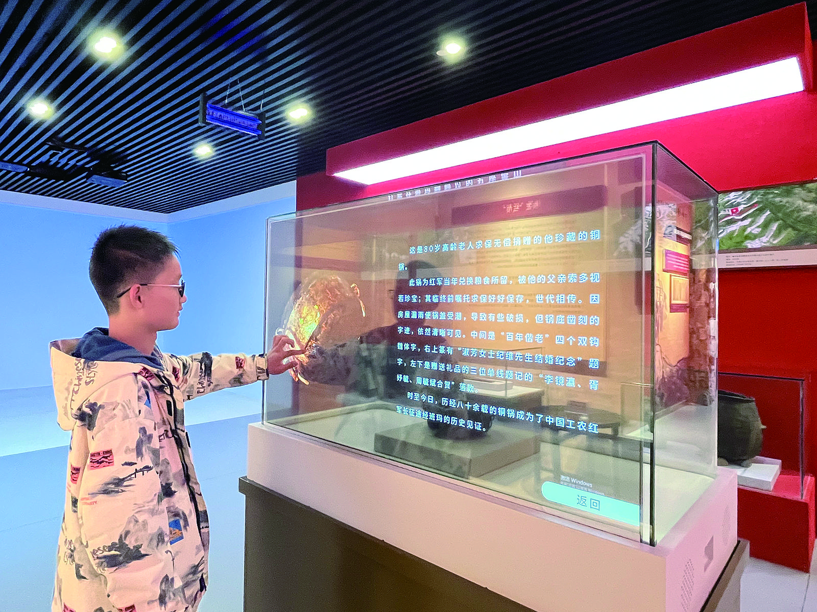 游客正在紅軍溝紀念館內觀看文物介紹。