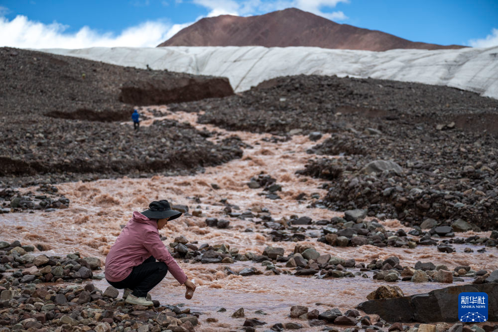 7月25日,科考隊員在冬克瑪?shù)妆ㄟM(jìn)行水樣采集工作。新華社記者 伍志尊 攝