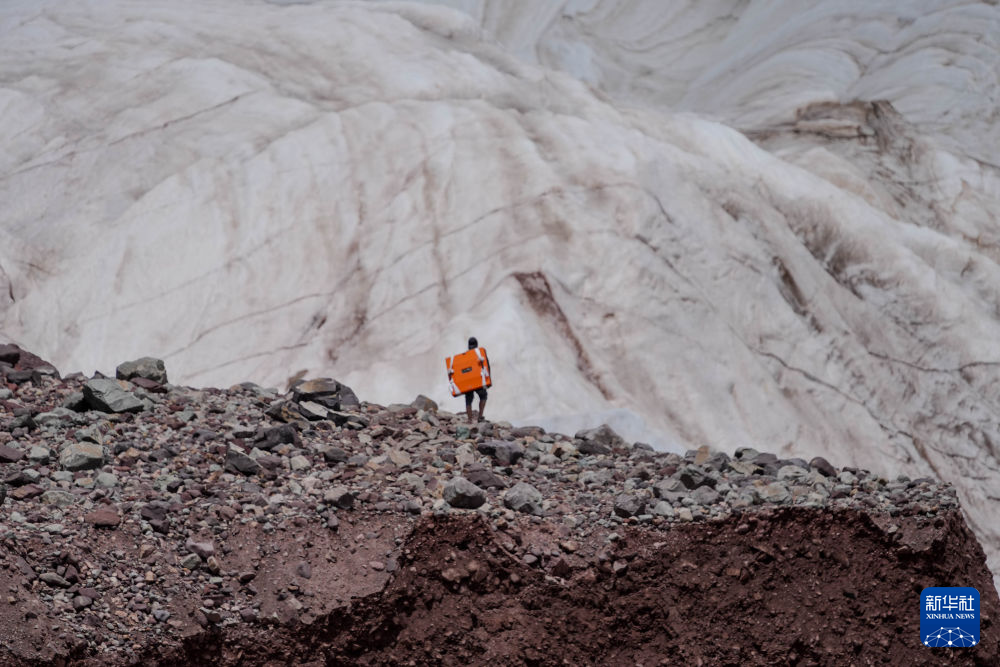 7月25日,在冬克瑪?shù)妆?,科考隊員在探測冰川(無人機照片)。新華社記者 伍志尊 攝