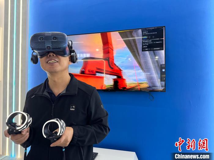圖為施工人員在施工項目部演示VR安全體驗。陳宗淇 攝