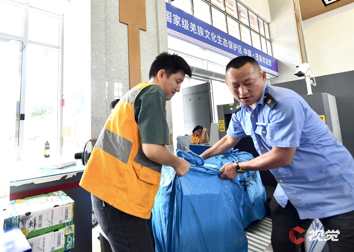 工作人員將快運(yùn)貨物送進(jìn)茂縣站。