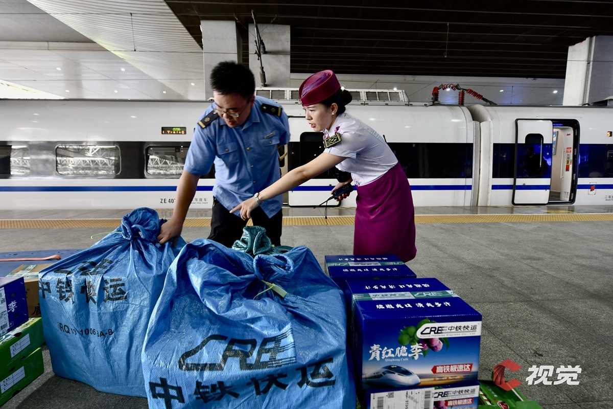 快運(yùn)貨物送達(dá)成都東站,工作人員在站臺上清點(diǎn)貨物。