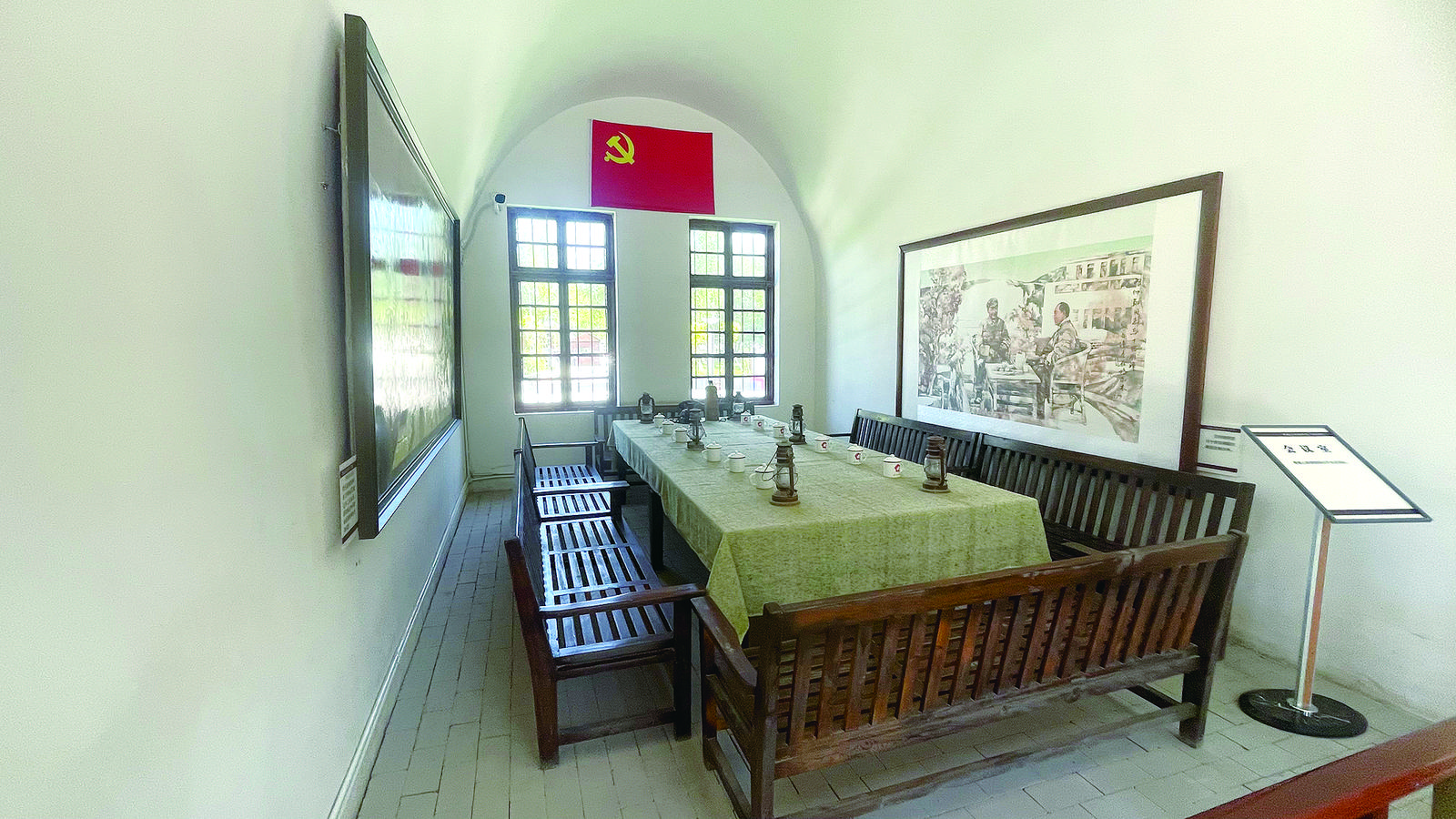 將軍樓的一樓是仿窯洞式建筑,會(huì)議室里彌漫著一種莊嚴(yán)的氛圍。辦公桌上那簡(jiǎn)單的辦公用品,似乎還留有當(dāng)年的印記,那是他們?yōu)閴?mèng)想奮斗的痕跡。