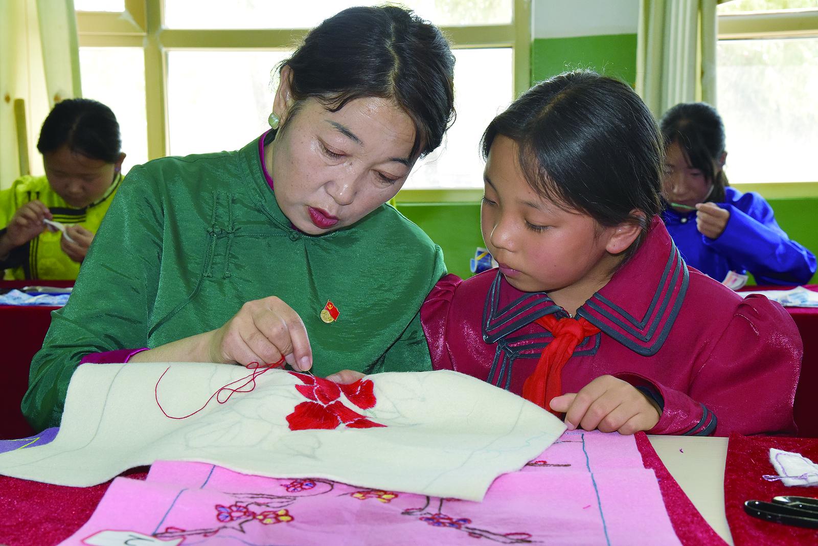 教學(xué)生蒙古族刺繡。蘇烽 攝