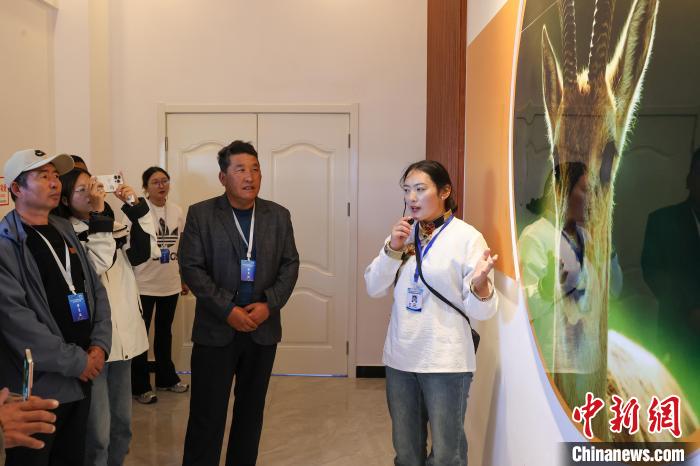 9月26日,在青海湖北岸的青海省海北藏族自治州剛察縣哈爾蓋普氏原羚科普研學教育基地內(nèi),講解員為參觀人員講解普氏原羚生活習性。目前,中國國家一級重點保護野生動物普氏原羚野外種群數(shù)量從監(jiān)測之初不足300只恢復至3000余只。普氏原羚現(xiàn)僅分布于青海湖環(huán)湖區(qū)域,其中,以剛察縣哈爾蓋河流域最為集中。中新社記者 薛蒂 攝