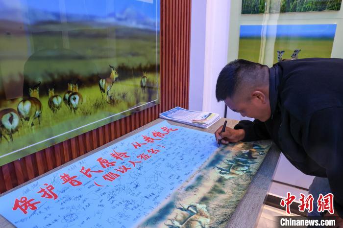 9月26日,在青海湖北岸的青海省海北藏族自治州剛察縣哈爾蓋普氏原羚科普研學教育基地內(nèi),參觀人員在保護普氏原羚倡議書上簽字。目前,中國國家一級重點保護野生動物普氏原羚野外種群數(shù)量從監(jiān)測之初不足300只恢復至3000余只。普氏原羚現(xiàn)僅分布于青海湖環(huán)湖區(qū)域,其中,以剛察縣哈爾蓋河流域最為集中。中新社記者 薛蒂 攝