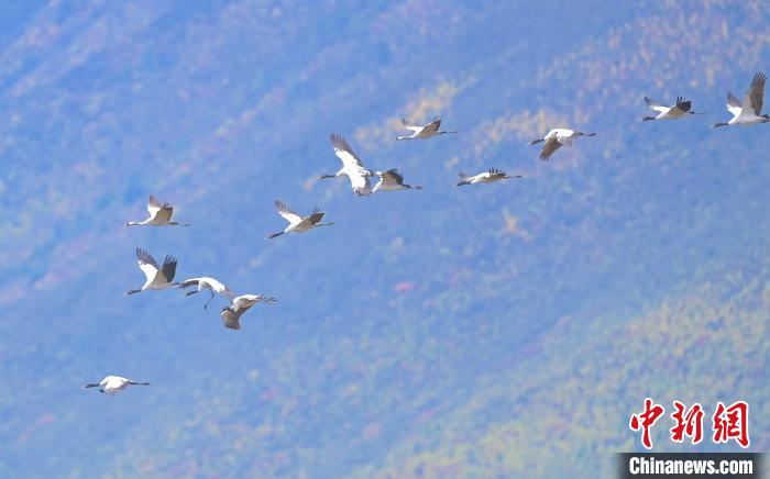 圖為黑頸鶴在納帕海上空飛翔。陳志明 攝