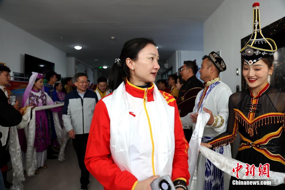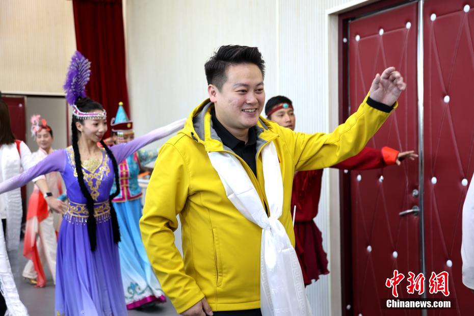 圖為北京奧運會蹦床冠軍陸春龍跟海南州民眾跳鍋莊舞。中新社記者 張?zhí)砀?攝