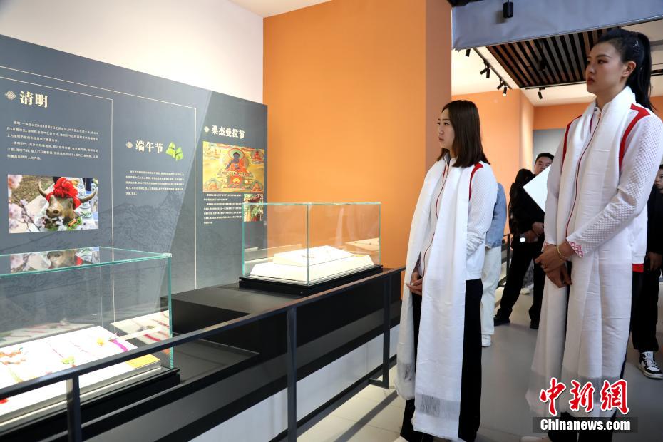 圖為巴黎奧運會花樣游泳冠軍王賜月(左)、里約奧運會女排冠軍張常寧參觀海南州民族文化展覽。中新社記者 張?zhí)砀?攝