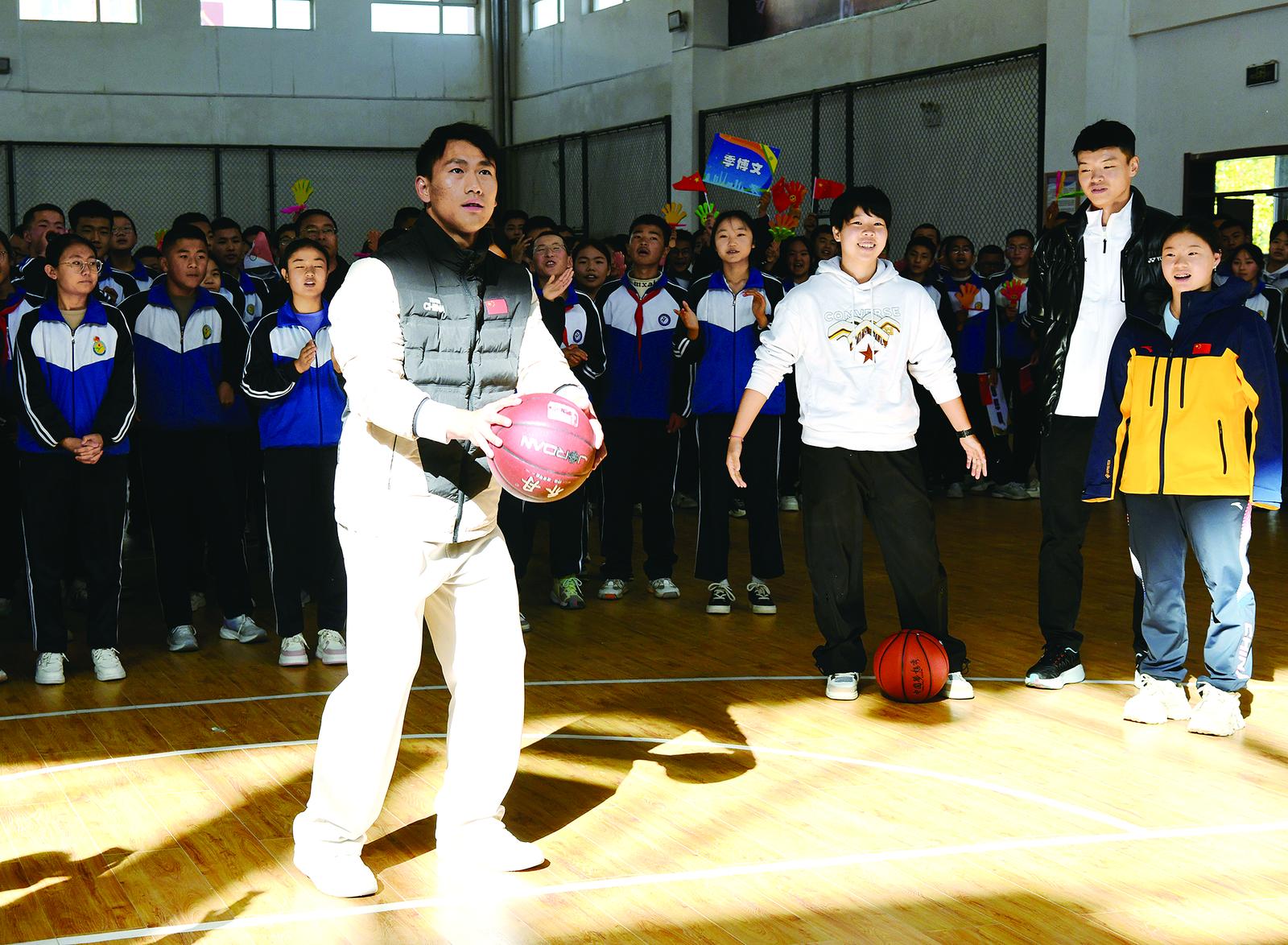 得到奧運冠軍的專屬掌聲是一種什么體驗?在德令哈市第二中學的體育館里,當同學們三步上籃將球穩(wěn)穩(wěn)投進籃筐的霎那間,現(xiàn)場響徹山呼海嘯般的喝彩聲,參與到游戲中的季博文、管晨辰、王懿律和戴倩倩也為進球的同學鼓掌喝彩,這一刻,成為同學們在運動場上最高光的時刻。