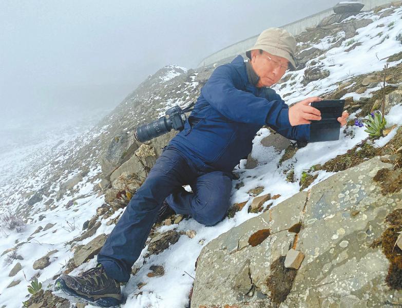 阿來在巴朗山拍花。四川日?qǐng)?bào)全媒體記者 肖姍姍 攝