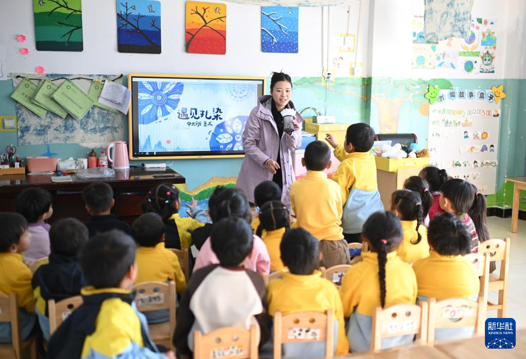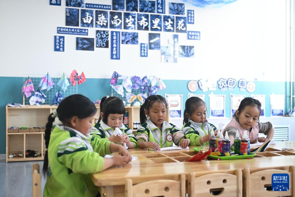 11月14日,在天峻縣民族幼兒園,小朋友學(xué)習(xí)扎染。新華社記者 李占軼 攝
