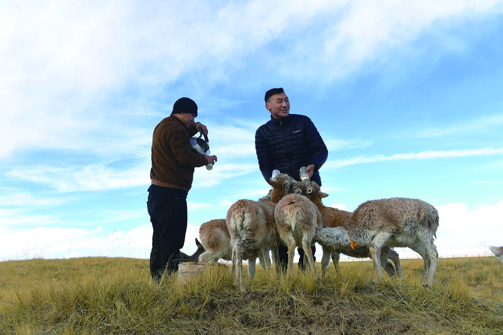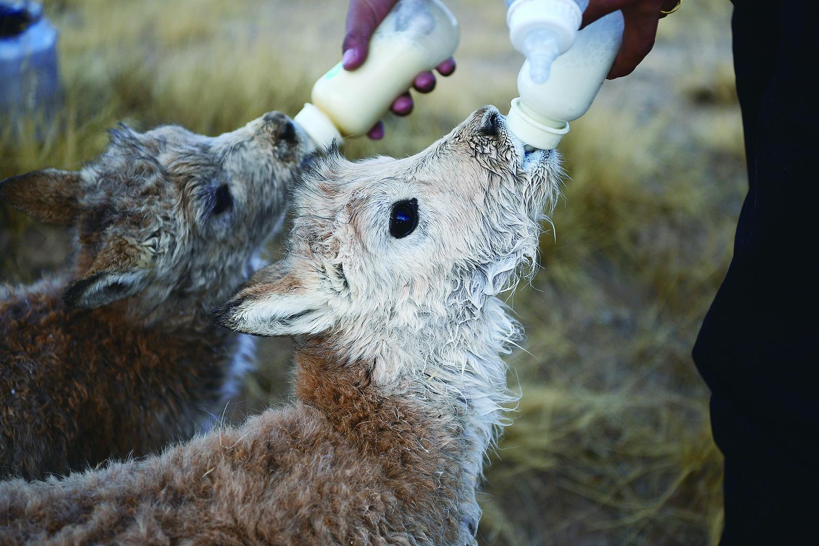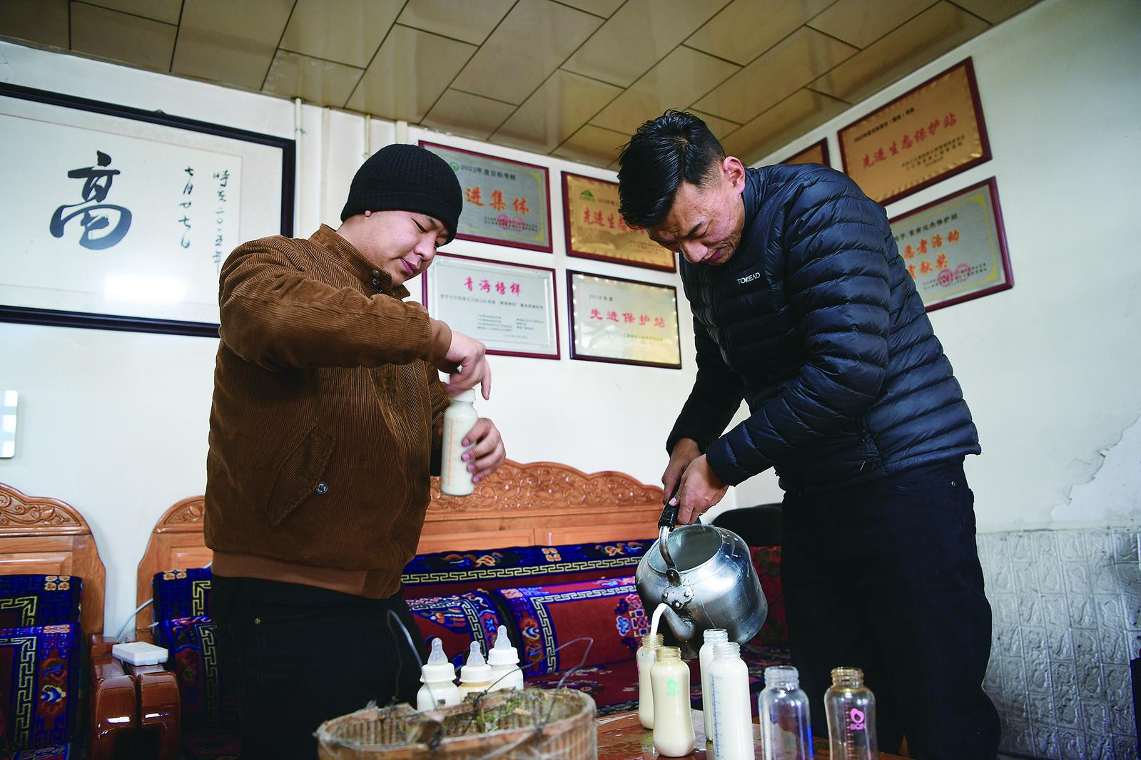 11月19日中午剛過,三江源國家公園索南達杰保護站內(nèi),才仁洛松和江措開始為小藏羚羊準備牛奶。牛奶燒開,涼到適合溫度,奶瓶用沸水浸泡沖洗,再將涼好的牛奶依次灌入奶瓶中,緊接著,才仁洛松和江措來到養(yǎng)護小藏羚羊的圍欄內(nèi),小藏羚羊遠遠看見兩人,咩、咩、咩地向兩人跑去,圍著兩人用頭親昵地頂著,好像在撒嬌。
