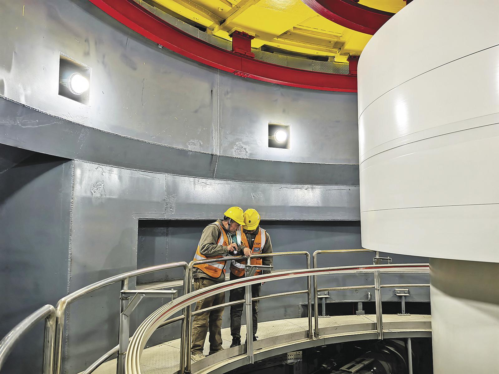 緊接著來到廠房內(nèi),顏增強(qiáng)帶著巡檢人員仔細(xì)檢查著設(shè)備運(yùn)行狀況,不放過任何一個(gè)細(xì)節(jié)。只見巡檢人員本子上密密麻麻記錄著每一天的巡檢數(shù)據(jù),順著狹窄的檢修樓梯往下走,巡檢第一站是水輪機(jī)層,顏增強(qiáng)熟練地繞著巨大的轉(zhuǎn)輪走了一圈,上下仔細(xì)掃了一遍,腳步聲與機(jī)器的轟鳴交織在一起。