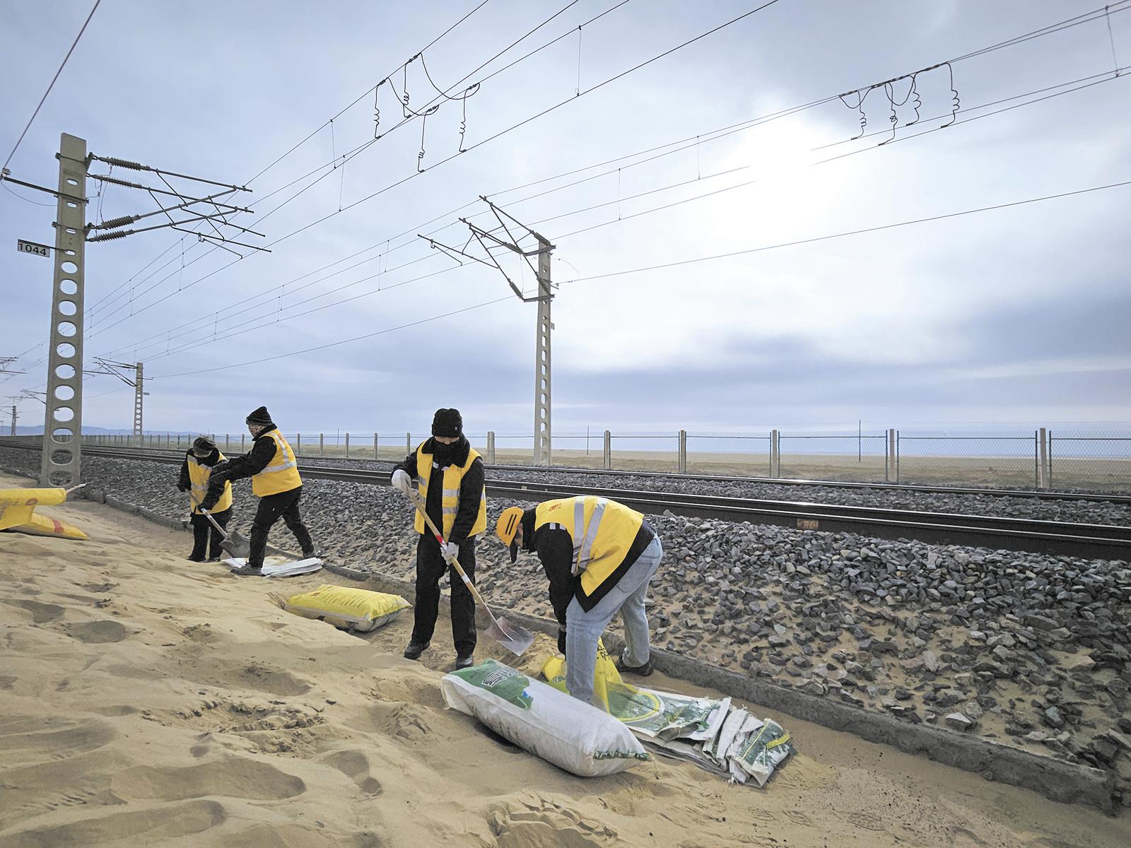 多年來,工區(qū)職工們反復探索,積累經(jīng)驗,采用“草方格”“石方格”“擋沙墻”“HDPE低立式防沙板”等一系列防沙治理措施,有效固定了流沙。但風不停息沙不止,風沙依舊不時侵入線路。