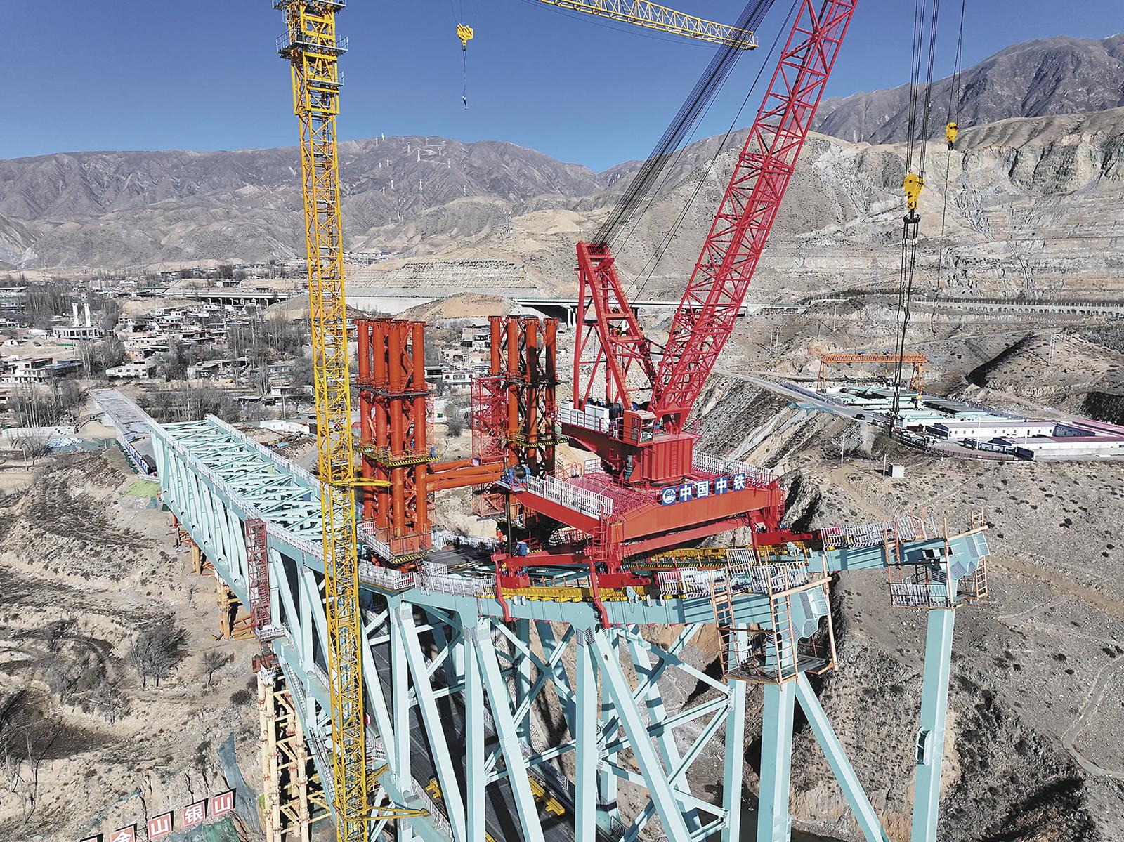 “川青鐵路尖扎黃河特大橋主橋鋼桁拱架設進度過半。”看著這一片熱火朝天、有序建設的場景,川青鐵路11標中鐵大橋局項目黨支部書記瞿小荃滿懷信心地介紹起項目進度,“黃河北岸已經(jīng)完成第14節(jié)間架設,南岸完成第12節(jié)間架設,主橋需要完成50個節(jié)間,目前共完成26個節(jié)間架設?!?/p>
