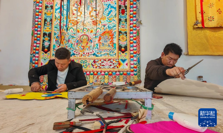 3月13日,同仁市年都乎鄉(xiāng)年都乎村村民在制作堆繡唐卡。新華社記者 白瑪央措 攝