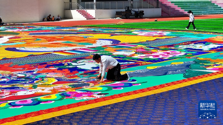 堆繡非遺傳承人夏吾才旦在制作巨幅堆繡唐卡(2024年8月15日攝)。新華社發(fā)