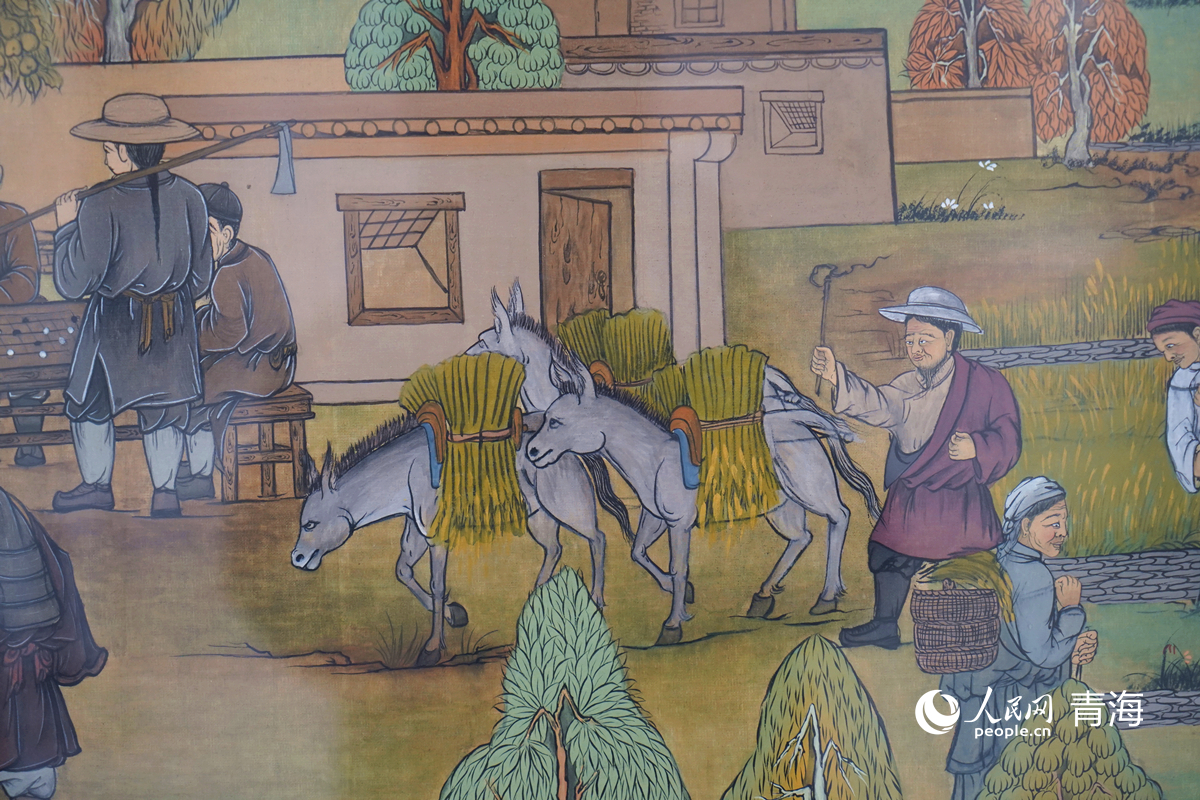 “隆務(wù)九曲圖”局部,展現(xiàn)的是當(dāng)?shù)厝罕娚顒谧鞯膱?chǎng)景。人民網(wǎng)記者 楊啟紅 攝