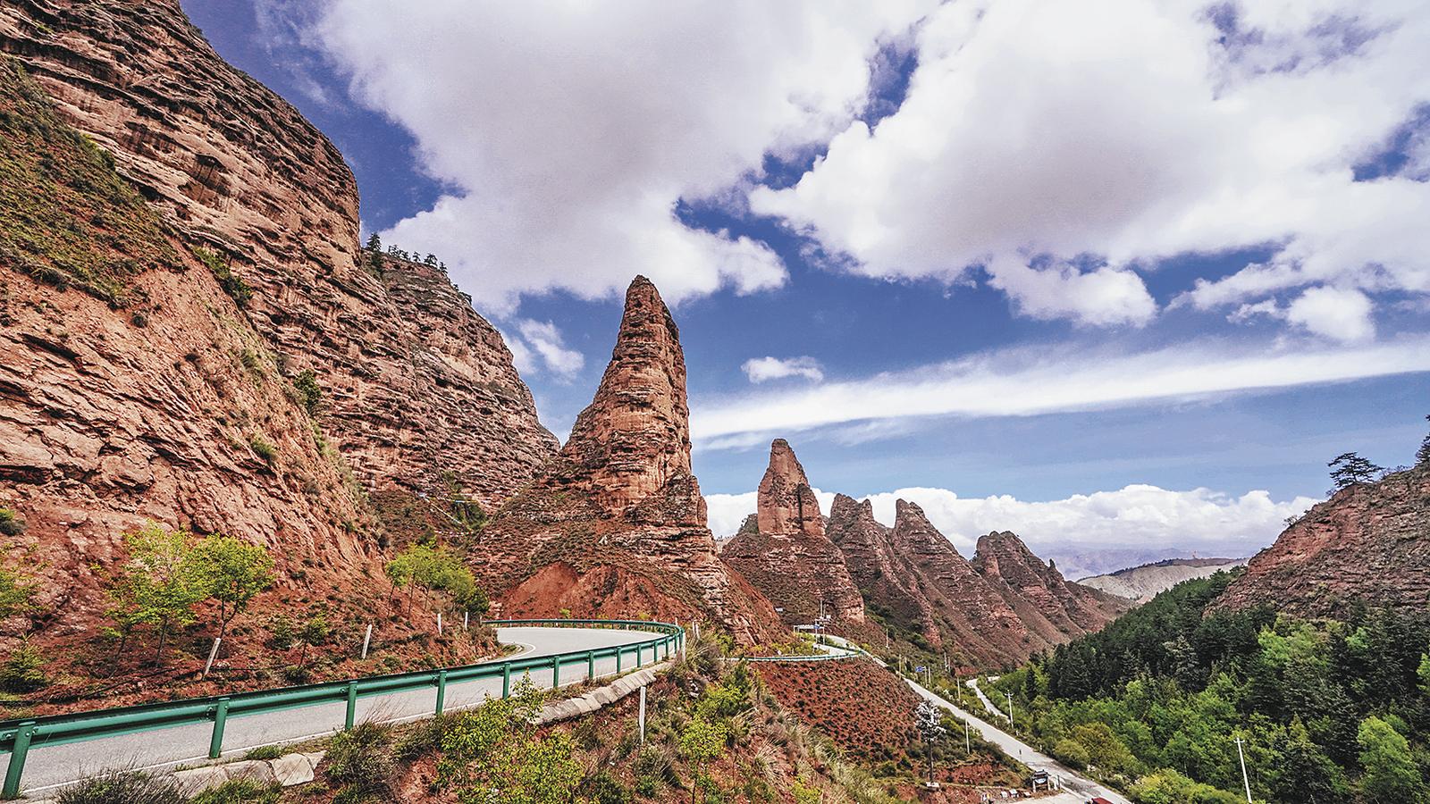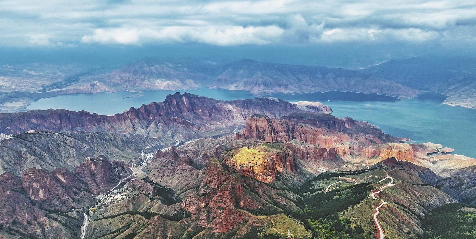 春風(fēng)輕拂,赤紅山脊在晨光中熠熠生輝,丹霞地貌的溝壑間仿佛鑲嵌著點(diǎn)點(diǎn)碎金。黃河在丹霞群峰間蜿蜒流淌,如一條翡翠綢帶。高原云杉在崖縫間挺立,枝頭簇?fù)?,迎接晨曦?/p>