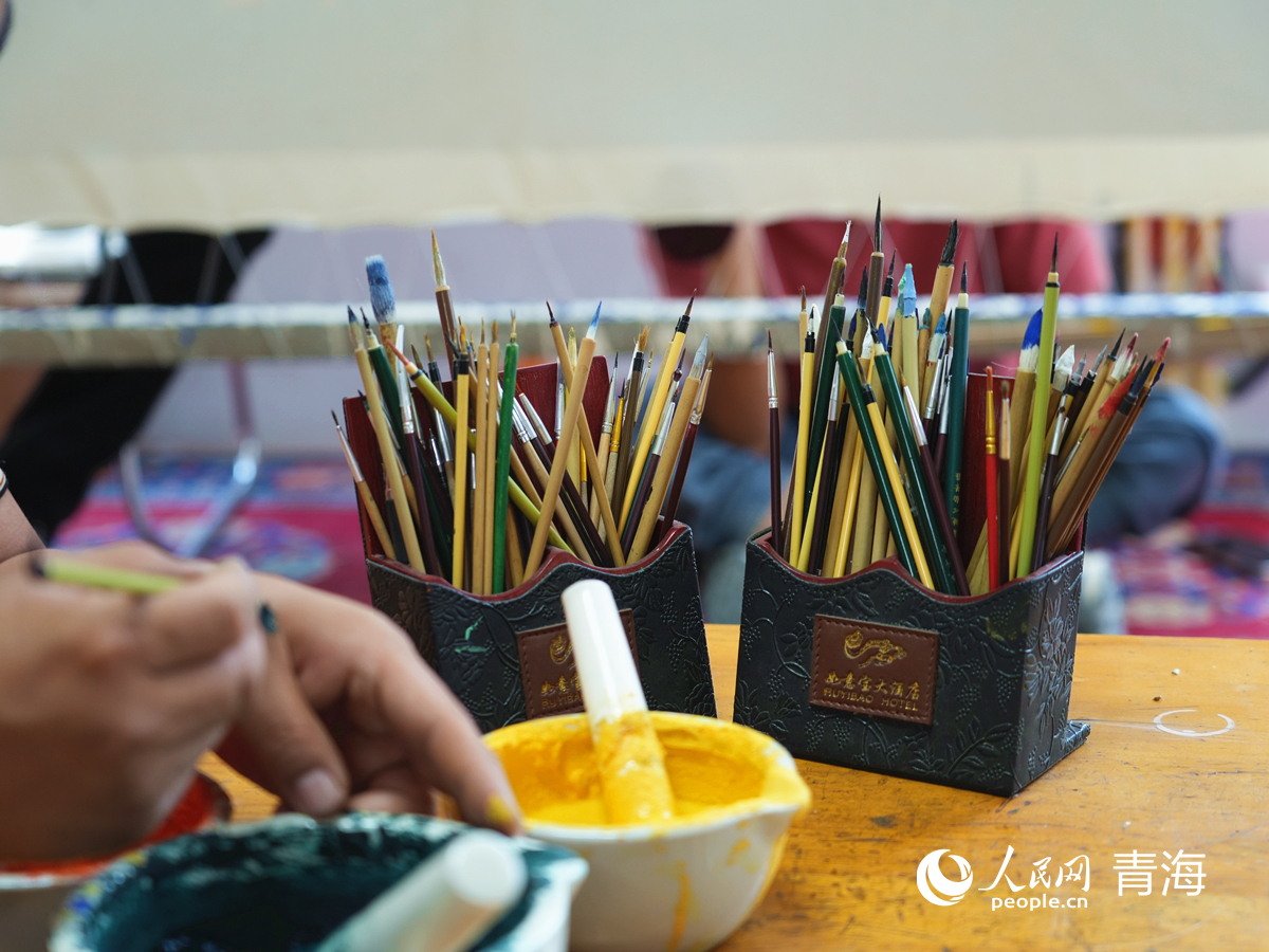 繪制唐卡,需要多種筆和顏料。人民網(wǎng)記者 楊啟紅 攝