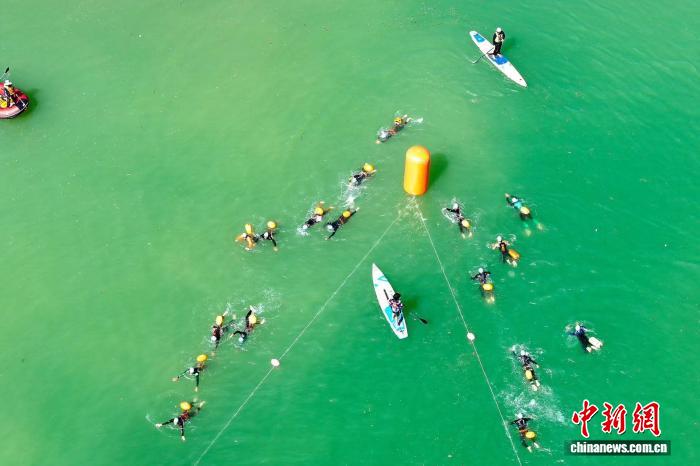航拍圖為參賽選手在黃河競游。薛蒂 攝