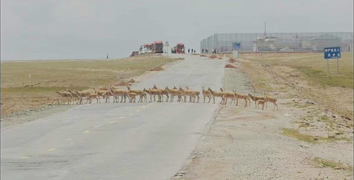 五道梁第一批回遷的藏羚羊穿過青藏公路??煽晌骼锕芾硖幑﹫D