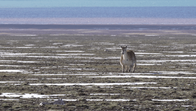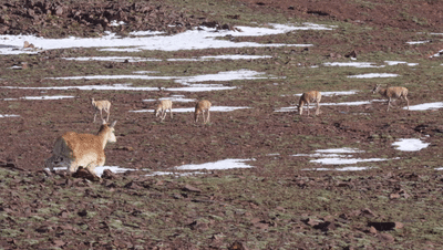 突然,離記者最近的一群藏羚羊旁邊,出現(xiàn)了一只步履稍顯僵硬的“藏羚羊”,腳步?jīng)]有那么輕盈,體型也更豐滿一些。不像其它藏羚羊一邊啃草一邊走動(dòng),這只“藏羚羊”一直昂著頭,“小心翼翼”卻又堅(jiān)定執(zhí)著地一點(diǎn)點(diǎn)靠近藏羚羊群。