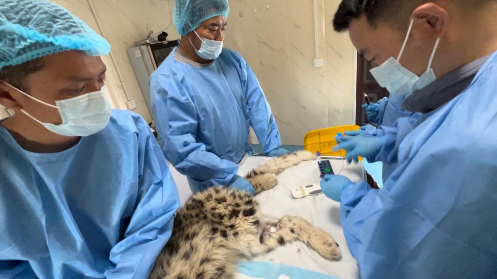 青海野生動物救護繁育中心工作人員在救治雪豹幼崽“凌小芒”。新華社發(fā)