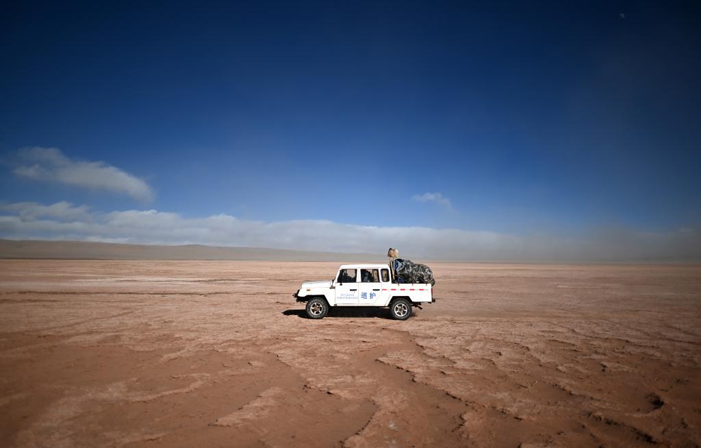 在可可西里卓乃湖區(qū)域附近,可可西里森林公安局巡山車輛在巡查途中。 新華社記者 張宏祥 攝