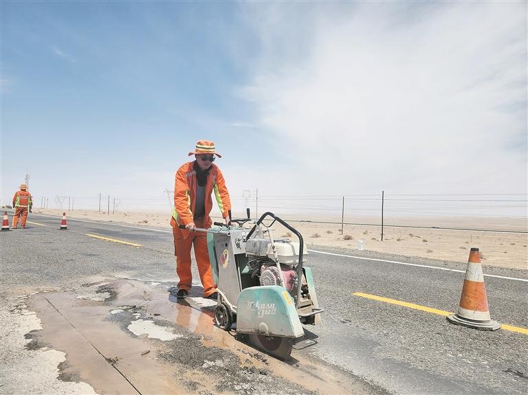 “你瞅這路面,夏天能曬到燙腳,冬天凍得全是縫子,水毀、冰凍說上來就上來?!倍∮谰S蹲下來,指著路面一塊剛補好的坑槽,指尖在新瀝青上劃了劃,“一年到頭,能好好補路的日子就七八個月,不跟老天爺搶時間,冬天車走這兒就懸了?!?/p>