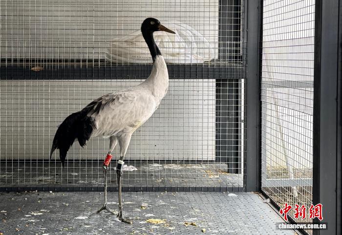 圖為救助康復(fù)的黑頸鶴腳上戴上了追蹤器。納帕海管護(hù)局 供圖