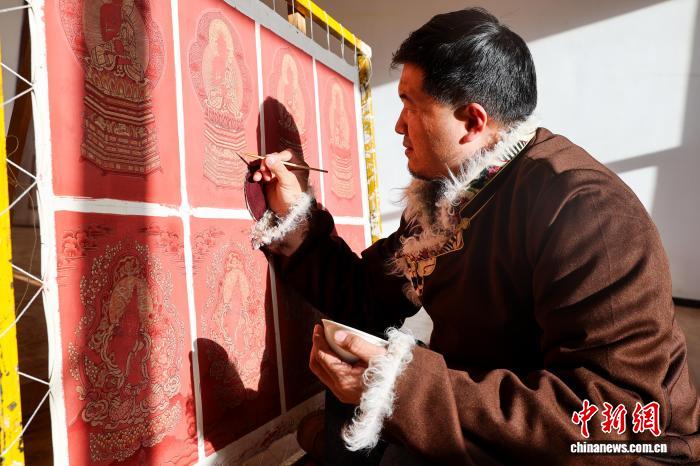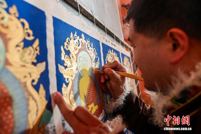 12月10日,青海省黃南藏族自治州同仁市勝境畫院內(nèi),唐卡畫師夏吾尖措繪制唐卡。熱貢唐卡源于當(dāng)?shù)鬲?dú)特的文化生態(tài),被譽(yù)為繪畫藝術(shù)中一面獨(dú)具韻味的旗幟。如今,許多畫師通過(guò)系統(tǒng)授徒、開(kāi)辦傳習(xí)工坊等方式,將調(diào)色、勾線、描金等核心技藝傳授給年輕一代,讓古老技藝得以傳承和延續(xù)。中新社記者 薛蒂 攝