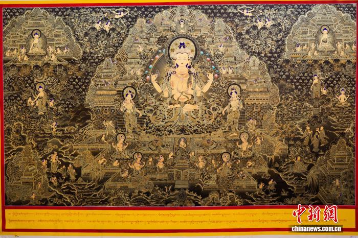 12月10日,青海省黃南藏族自治州同仁市勝境畫院內(nèi),夏吾尖措繪制的唐卡作品。熱貢唐卡源于當(dāng)?shù)鬲?dú)特的文化生態(tài),被譽(yù)為繪畫藝術(shù)中一面獨(dú)具韻味的旗幟。如今,許多畫師通過(guò)系統(tǒng)授徒、開(kāi)辦傳習(xí)工坊等方式,將調(diào)色、勾線、描金等核心技藝傳授給年輕一代,讓古老技藝得以傳承和延續(xù)。中新社記者 薛蒂 攝
