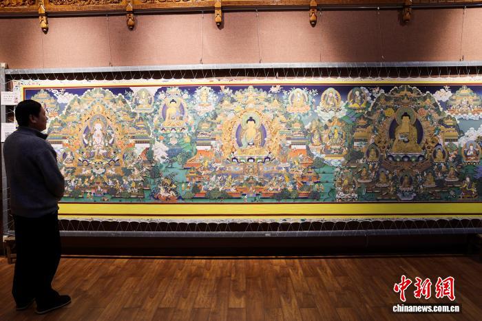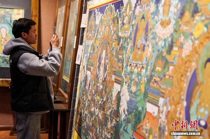 12月10日,青海省黃南藏族自治州同仁市勝境畫院內(nèi),一名學(xué)生觀賞唐卡畫師夏吾尖措的作品。熱貢唐卡源于當(dāng)?shù)鬲?dú)特的文化生態(tài),被譽(yù)為繪畫藝術(shù)中一面獨(dú)具韻味的旗幟。如今,許多畫師通過(guò)系統(tǒng)授徒、開(kāi)辦傳習(xí)工坊等方式,將調(diào)色、勾線、描金等核心技藝傳授給年輕一代,讓古老技藝得以傳承和延續(xù)。中新社記者 薛蒂 攝