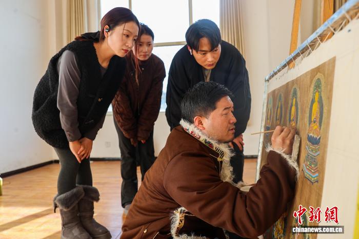 12月10日,青海省黃南藏族自治州同仁市勝境畫院內(nèi),唐卡畫師夏吾尖措(右一)為學(xué)生示范唐卡繪畫技藝。熱貢唐卡源于當(dāng)?shù)鬲?dú)特的文化生態(tài),被譽(yù)為繪畫藝術(shù)中一面獨(dú)具韻味的旗幟。如今,許多畫師通過(guò)系統(tǒng)授徒、開(kāi)辦傳習(xí)工坊等方式,將調(diào)色、勾線、描金等核心技藝傳授給年輕一代,讓古老技藝得以傳承和延續(xù)。中新社記者 薛蒂 攝