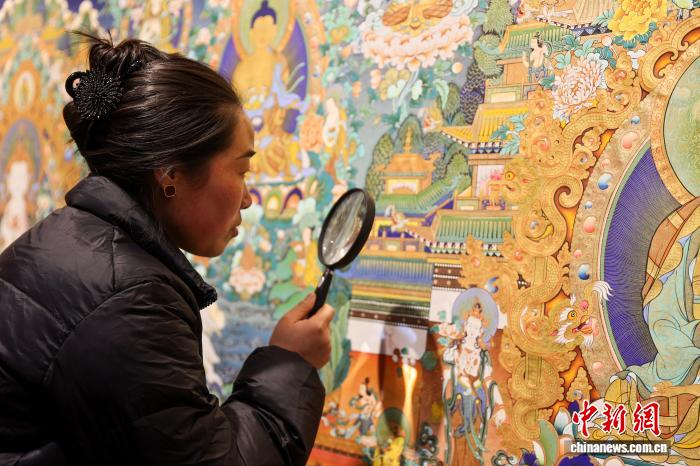 12月10日,青海省黃南藏族自治州同仁市勝境畫院內(nèi),學(xué)生用放大鏡觀看唐卡畫師夏吾尖措的作品。熱貢唐卡源于當(dāng)?shù)鬲?dú)特的文化生態(tài),被譽(yù)為繪畫藝術(shù)中一面獨(dú)具韻味的旗幟。如今,許多畫師通過(guò)系統(tǒng)授徒、開(kāi)辦傳習(xí)工坊等方式,將調(diào)色、勾線、描金等核心技藝傳授給年輕一代,讓古老技藝得以傳承和延續(xù)。中新社記者 薛蒂 攝