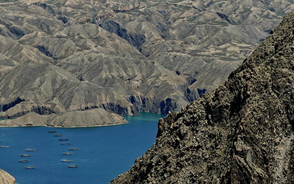 將視角從湖面升到高空,龍羊峽水庫(kù)平湖區(qū)的水面上,數(shù)個(gè)大大的圓圈整齊排開(kāi),這些都是虹鱒魚(yú)的養(yǎng)殖網(wǎng)箱。疏密有致的網(wǎng)箱內(nèi),一條條肥碩的虹鱒魚(yú)翻騰跳躍。