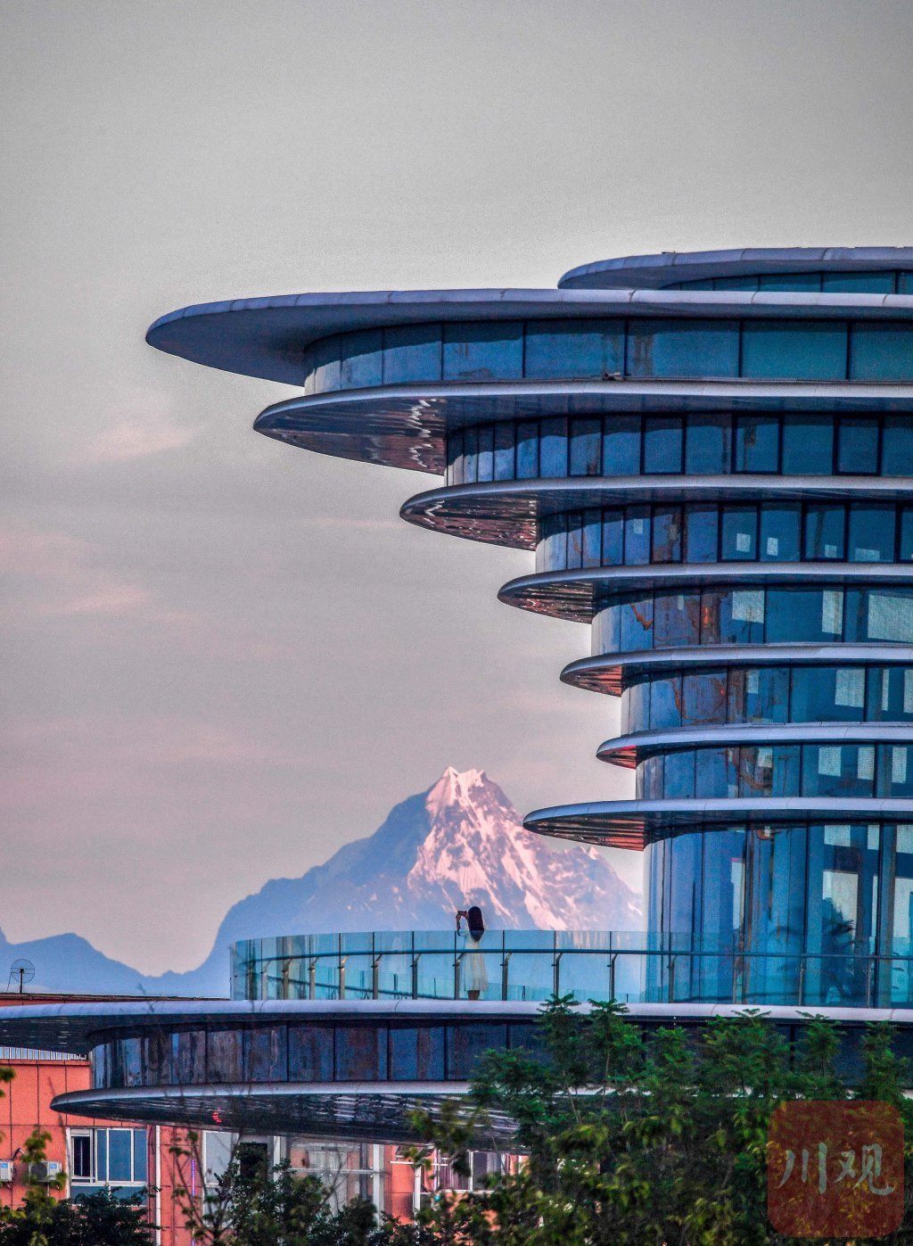 市民在成都市雙流區(qū)空港云的建筑上眺望幺妹峰。何海洋 攝