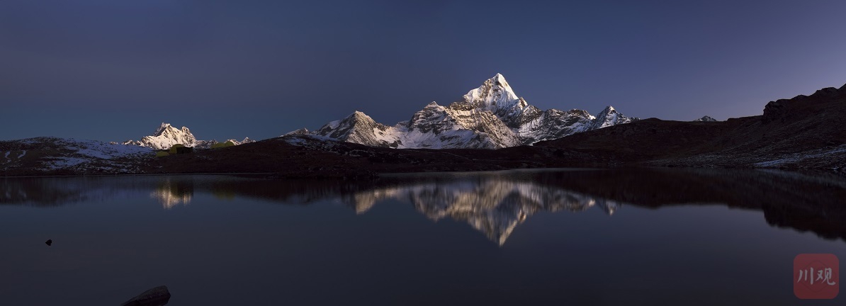 晨光中的四姑娘山與八角棚海子。王達軍 攝