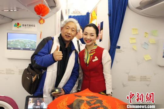 “這是我第二次乘坐西藏航空的春節(jié)主題航班,去年這個(gè)時(shí)候是在飛機(jī)上包餃子,他們每次春節(jié)的活動(dòng)都讓我記憶深刻?!背俗鞑睾娇蘸桨嗟目迪壬闷鹪?huà)機(jī)在機(jī)艙里說(shuō)。