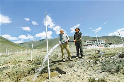 圖為近日,拉薩市墨竹工卡縣唐加鄉(xiāng)沖尼村村民在為新栽種的樹(shù)苗澆水。唐斌 攝